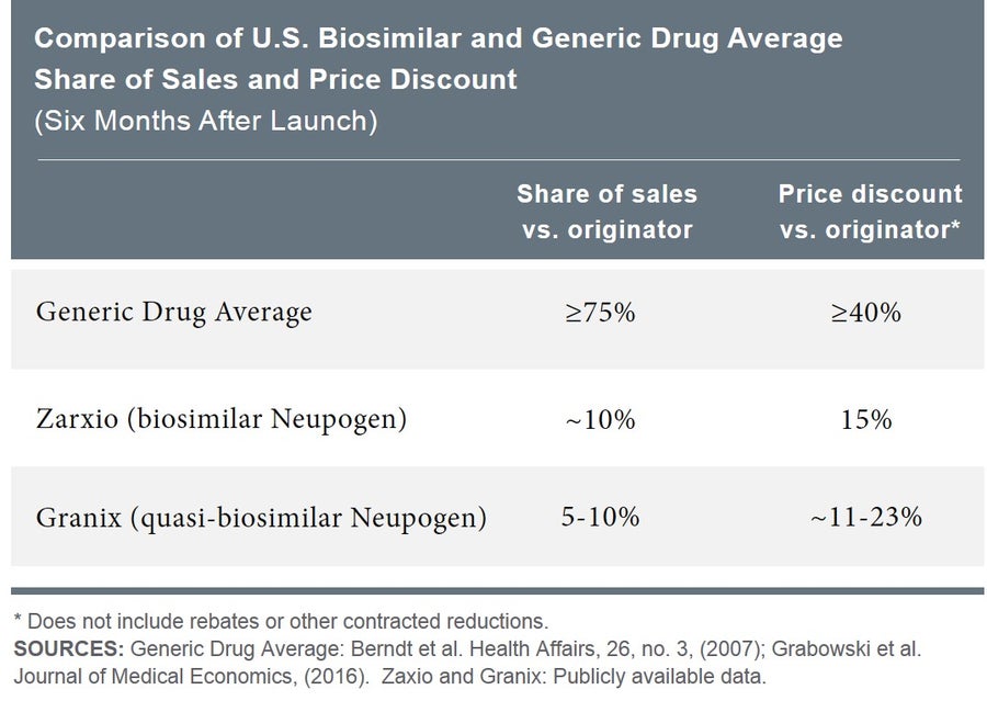实证证据表明,典型的仿制药进入市场的影响是迅速的。在仿制药上市后的六个月内,品牌小分子药物平均损失超过75%的销售额,仿制药相对于品牌药的价格折扣平均超过40%。相比之下,当生物类似药Zarxio上市时,品牌生物药品Neupogen仅损失了约10%的市场份额,而Zarxio的价格折扣仅为15%。这与早先上市的准生物类似药Granix的经验相当。
